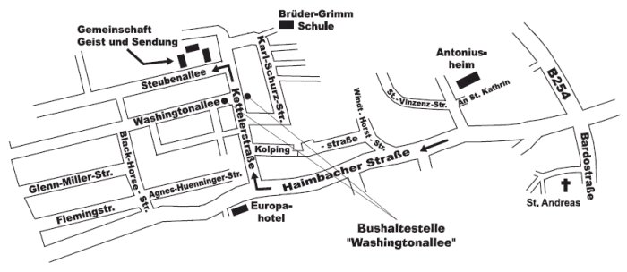 Von Fulda kommend die Haimbacher Straße in Richtung Haimbach fahren. Nach ca. 1 km rechts in die Kettelerstraße abbiegen (dem Hinweisschild "Brüder-Grimm-Schule" folgen). Von der Kettelerstraße nach links in die Steubenallee abbiegen (2. Straße links). Unsere Häuser liegen direkt am Parkplatz. Siehe auch die Anfahrtskizze.